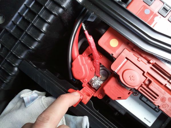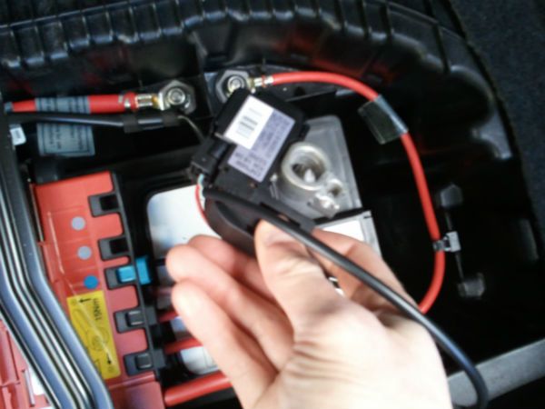 3. mit einer 10mm Nuss den schwarzen - (Minus)Polanschluss direkt an der Batterie abschrauben.(Dieser Pol ist mit dem Fahrgestell eures Autos verbunden) Den ganzen Ringanschluss dann nach oben abziehen. Kann etwas fest sitzen. Den Stecker dann rechts zwischen Batterie und Bodenplatte hochkannt reinlegen. Wenn ihr auf Nummer sicher gehen wollt deckt ihr dies nun mit einem nicht leitenden Gegenstand ab.