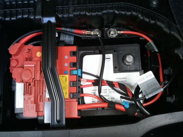 20. Nun könnt ihr das kurze Ende bereits mit der Batterie verbinden. Dazu den kleinen Plastikdecker öffnen, die Schraube (10mm Nuss) lösen und den Kabelschuh drunterstecken. Zuschrauben. Sieht dann so aus.