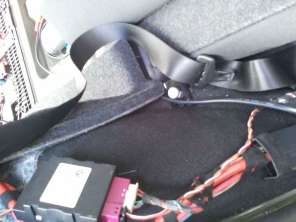 8. Nun Positionswechsel auf die Beifahrerhintertür. Die Seitenrückenstütze (dort, wo der Anschnallgurt drüber verläuft) mit einem Ruck in Richtung Innenraum ziehen. Dieses Teil ist auch nur gesteckt. Dann einfach herausnehmen. Das Kabel nun von unter der Filzabdeckung im Kofferraum in den geöffneten Raum verlegen.