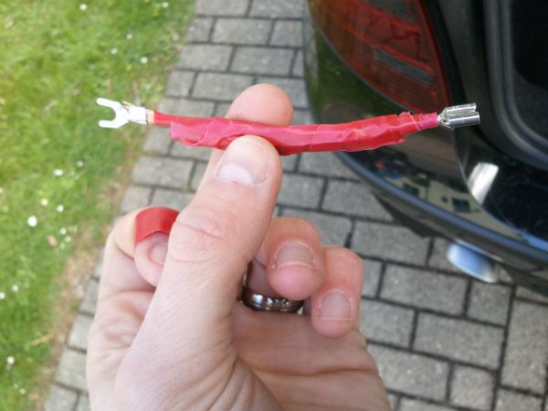 19. Nun kommen an beide entstandenen Enden die Steckverbindungen für die Autosicherung. Ich habe alles noch mit rotem Isolierband umwickelt