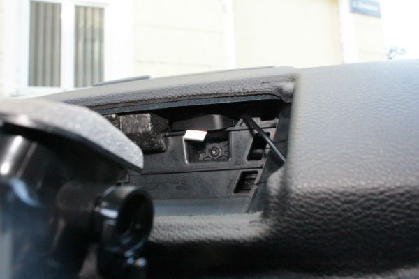 Nach erfolgreicher Erprobung nahm der GPS-Empfänger hinter den mittleren Lüftungen neben dem Ablagefach Platz. Ein Tesa-Powerstrip sorgt für die notwendige Haftung.