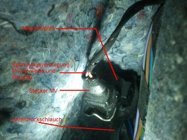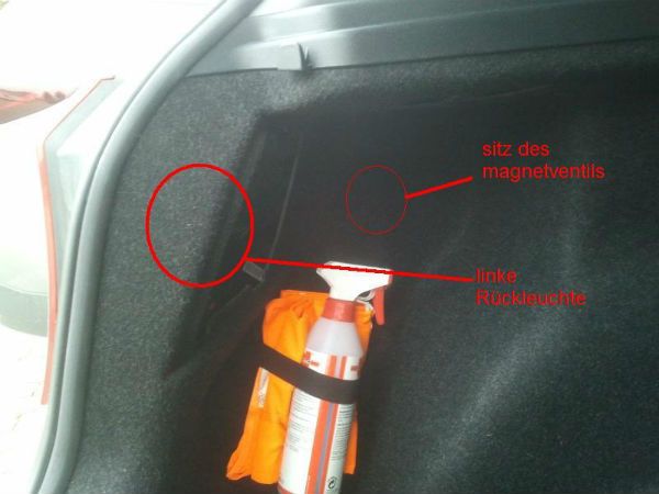 1.als erstes habe ich die abdeckung der linken rückleute im kofferraum entfernt und mir hinter der kofferraumverkleidung das magnetventil angeschaut.dieses hat oben einen stecker mit 2 kabeln(rot/weiss und lila/grau)