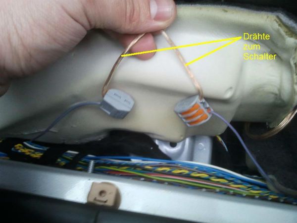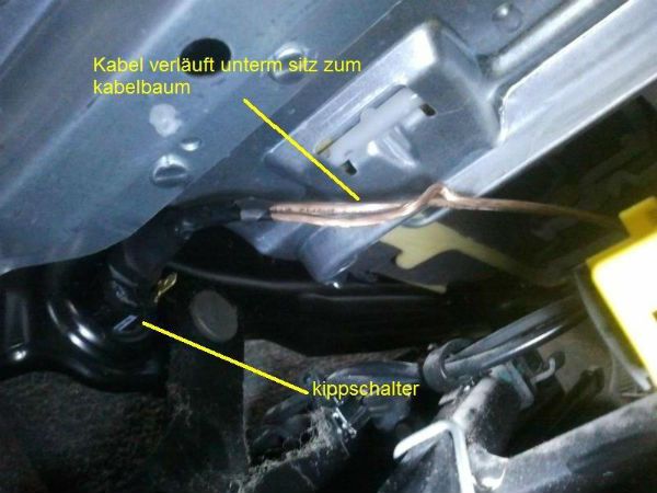 7.zu guter letzt verlegt man das kabel unterm fahrersitz in richtung kabelbaum und schliesst die anderen beiden anden jeweils an eine der beiden kabelklemmen ab.
