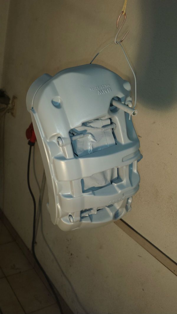 Zunächst werden die Sättel fein säuberlich an einem Robusten Seil aufgehängt. Anschließend großzügig mit Silikonentferner eingesprüht und mit Küchenpapier abgerieben. Hier gilt: keine Macht dem Fett. Die Teile müssen absolut sauber sein, sonst habt ihr nachher nur Ärger.