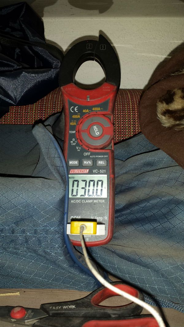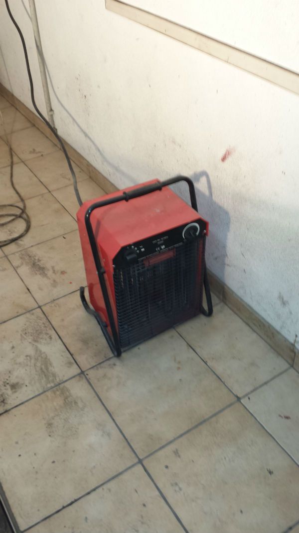 Deshalb ein kurzer Abstecher in meine improvisierte Lackierkabine. Grade Spraydosen vertragen niedrige Temperaturen überhaupt nicht. Deshalb habe ich einen 400V Heißlüfter in die Garage gestellt und voll aufgedreht. Parallel habe ich die Temperatur überwacht.