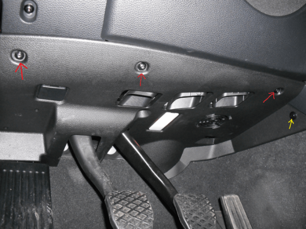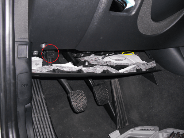 Stecker (roter Kreis) lösen und Kabel (gelber Kreis hinter der Dämmung) aus der Halterung ziehen; anschließend Verkleidung abnehmen