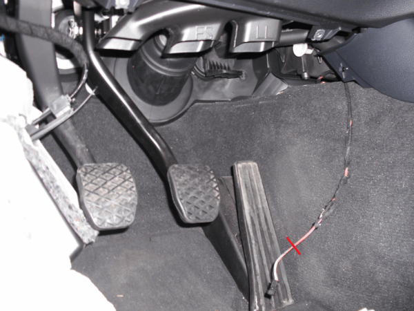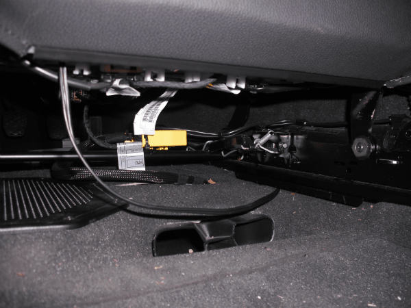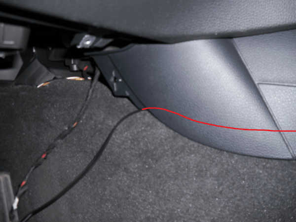 Verkleidung einfach mit den Fingern etwas anheben und das Kabel dahinter schieben; das Kabel verläuft nun gemäß der roten Linie nach hinten zum Sitz