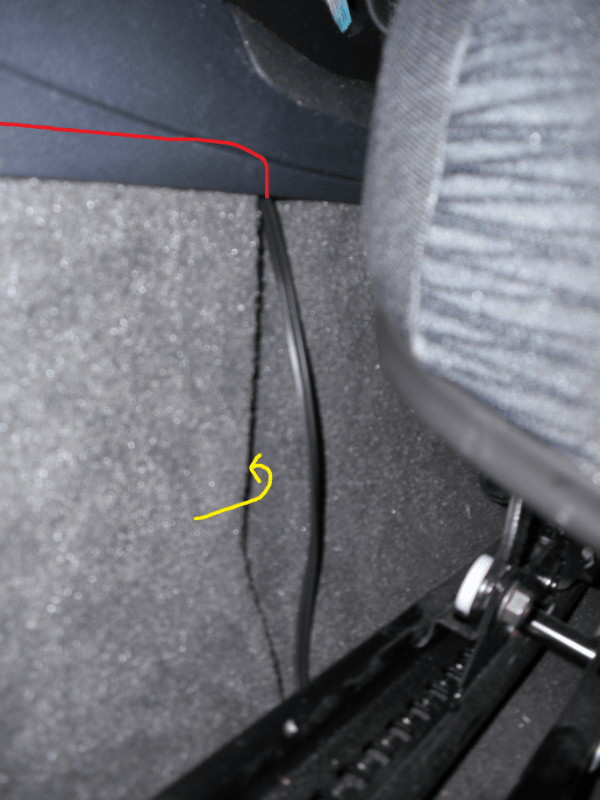 (Kabelverlauf durch rote Linie angedeutet) an dieser "Fuge" das Kabel wieder aus der Verkleidung führen (Fuge ist auf Höhe des Sitzes) und unten durch die Sitzschiene fädeln. Dann das Kabel hinter dem Teppich verstecken (gelber Pfeil)