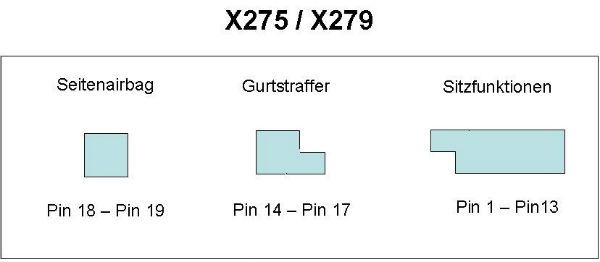 Der gelbe Stecker der die Verbindung zwischen Sitz und Fahrzeug herstellt (X275 / X279), ist sitzseitig 3-geteilt. Ein Stecker mit 2 Pins ist für die Seitenairbags, ein Stecker mit 4 Pins für den Gurtstraffer und Überwachung der Gurtfalle und ein Stecker mit 13 Pins für die Sitzfunktionen. Die Belegung der Stecker sind auf den folgenden Bildern erklärt.