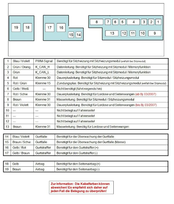 Es empfiehlt sich, die alten Sitze vorher schon mal auszubauen und zu schauen wie der gelbe Verbindungsstecker unter dem Sitz belegt ist.